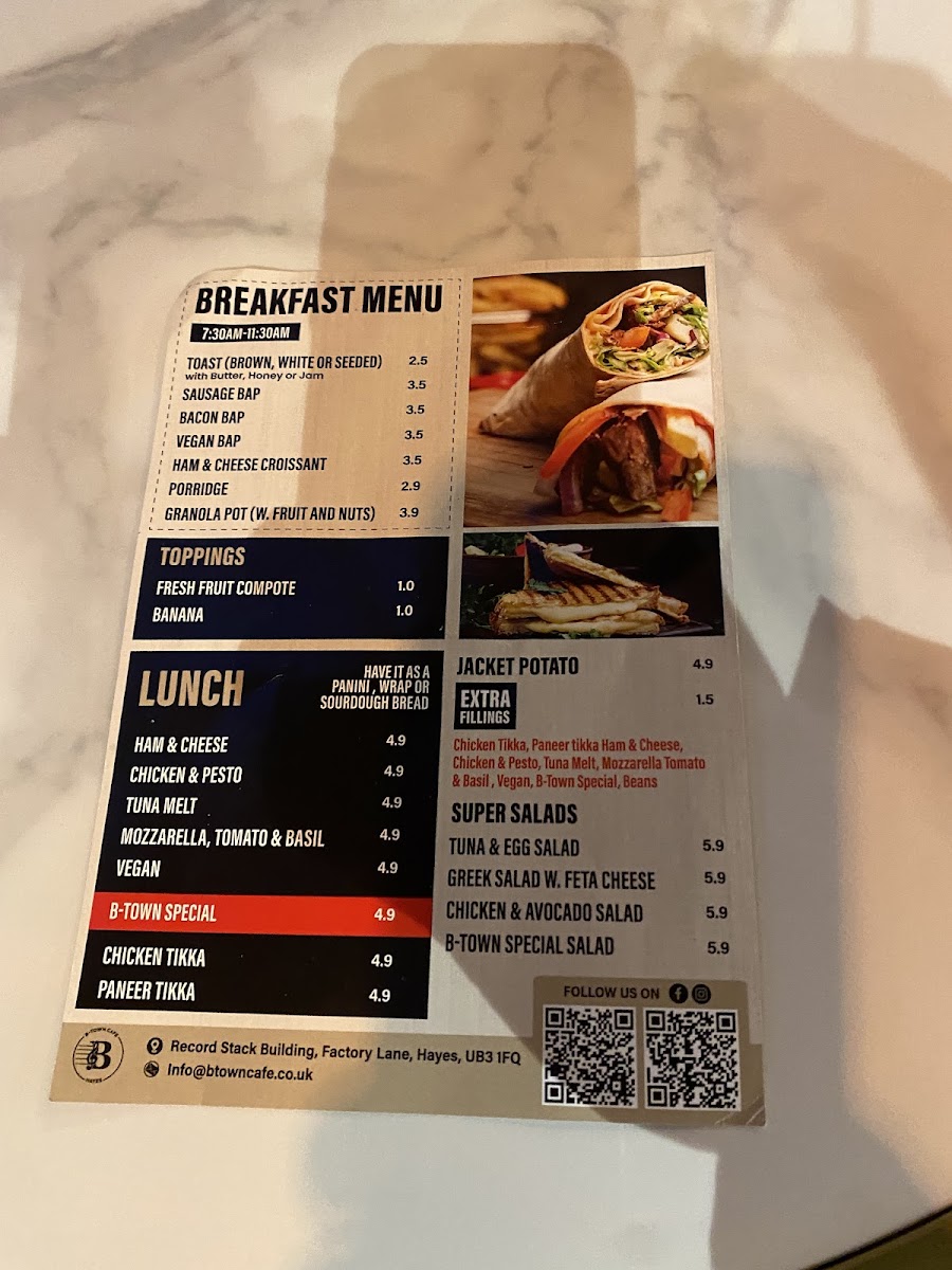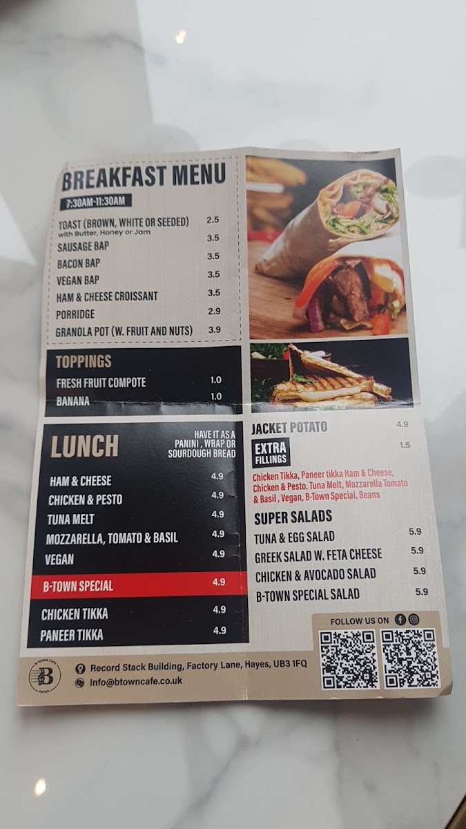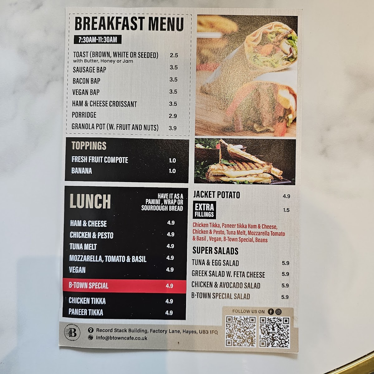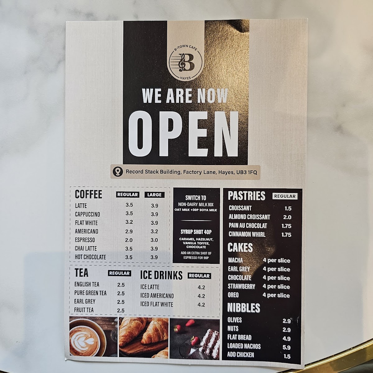 B-Town Café, a hidden gem nestled within the Record Stack Building on Factory Lane, Hayes, is more than just a café—it's a community hub where coffee lovers and food enthusiasts unite. With an inviting atmosphere characterized by warm lighting and cozy seating, this charming spot offers the perfect setting for a casual meeting, relaxation, or a quick getaway from the hustle and bustle of everyday life.